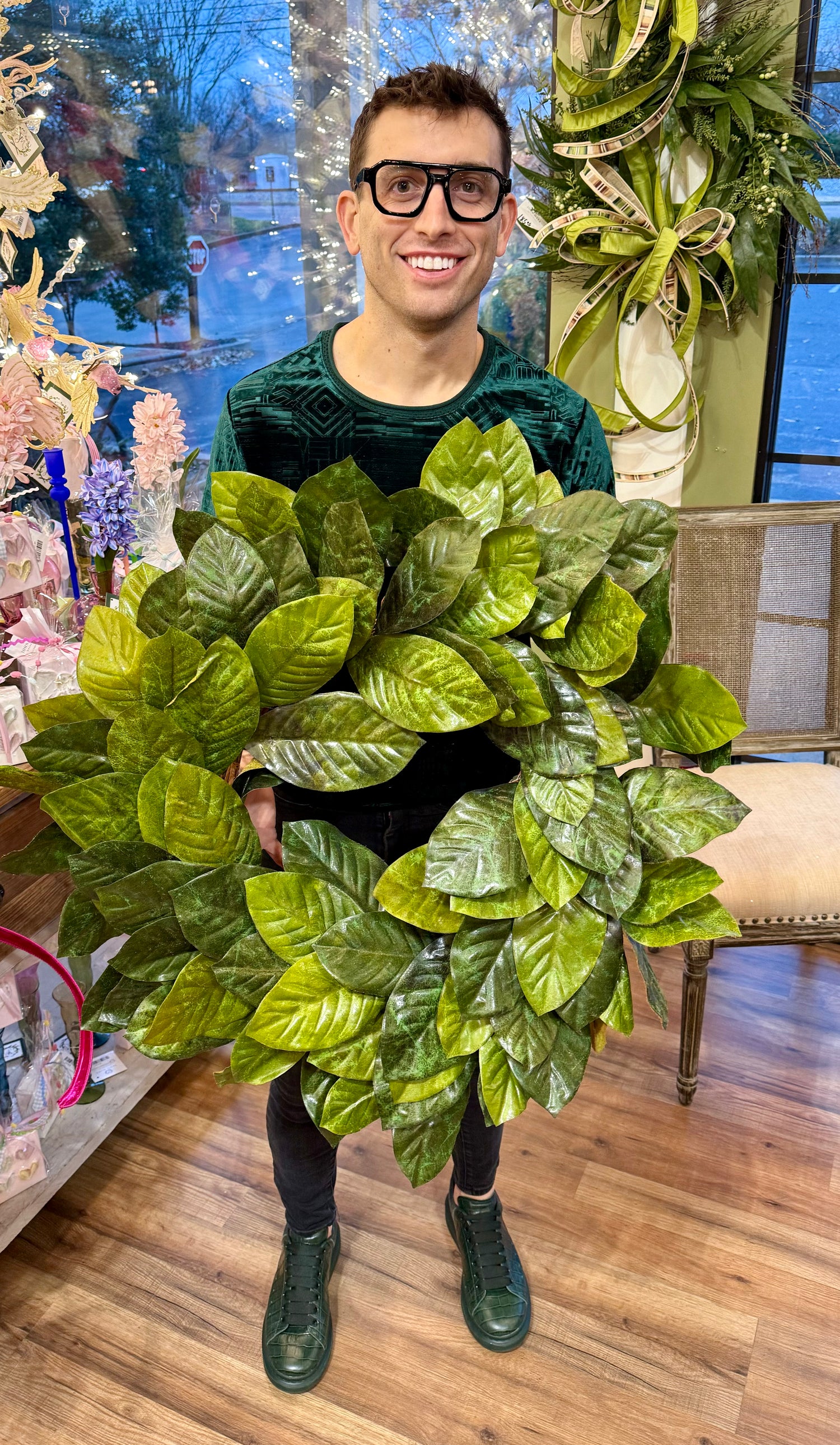 Faux magnolia wreath. Approximately 24 inches.