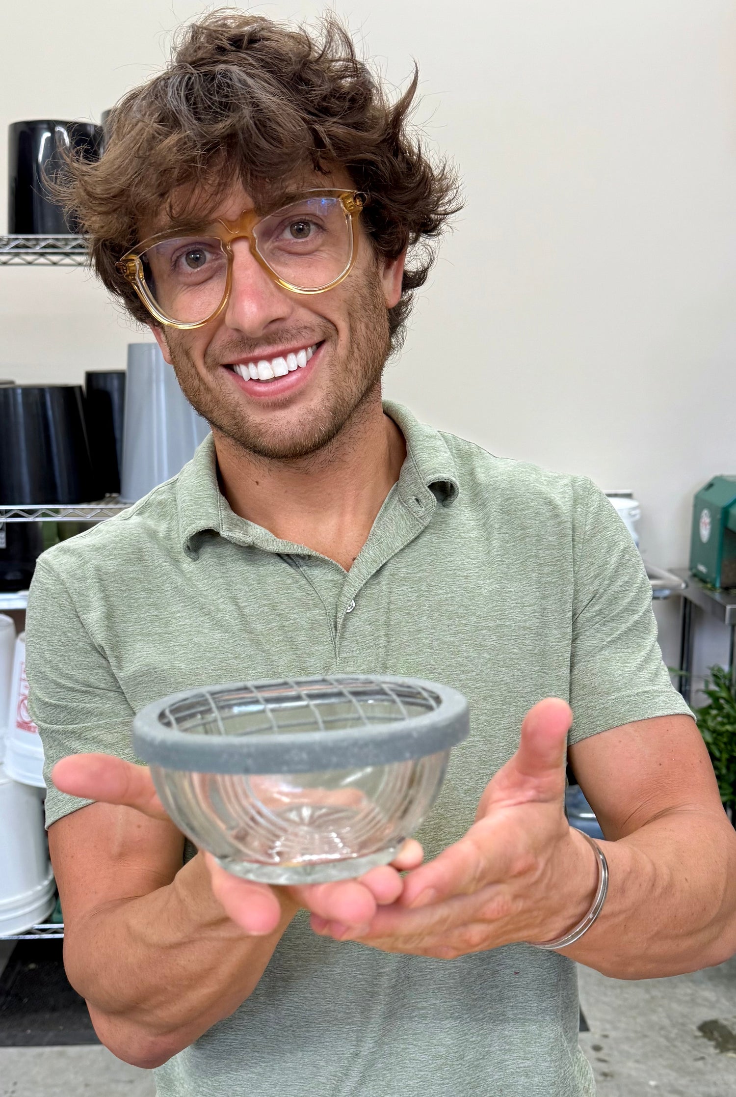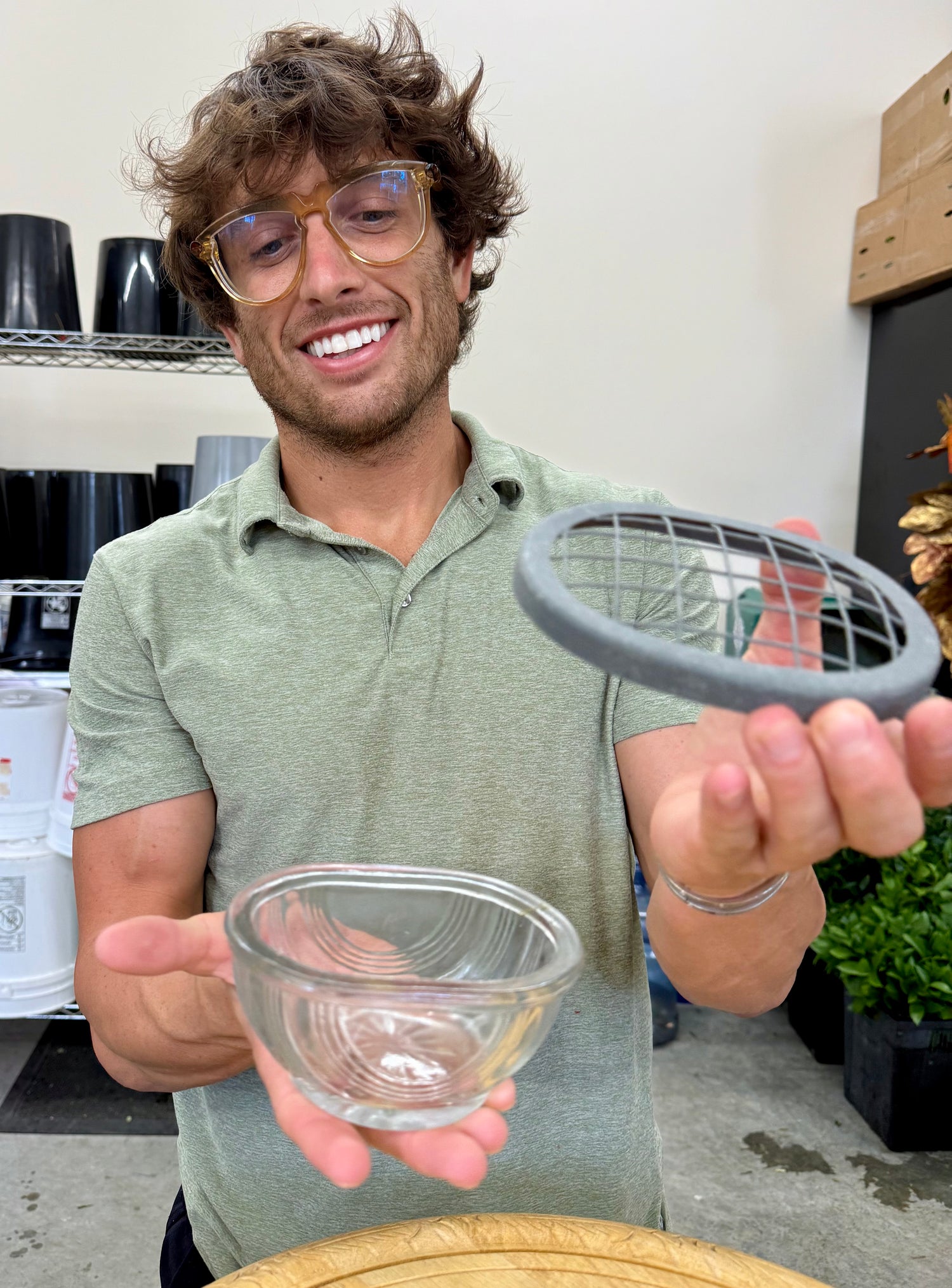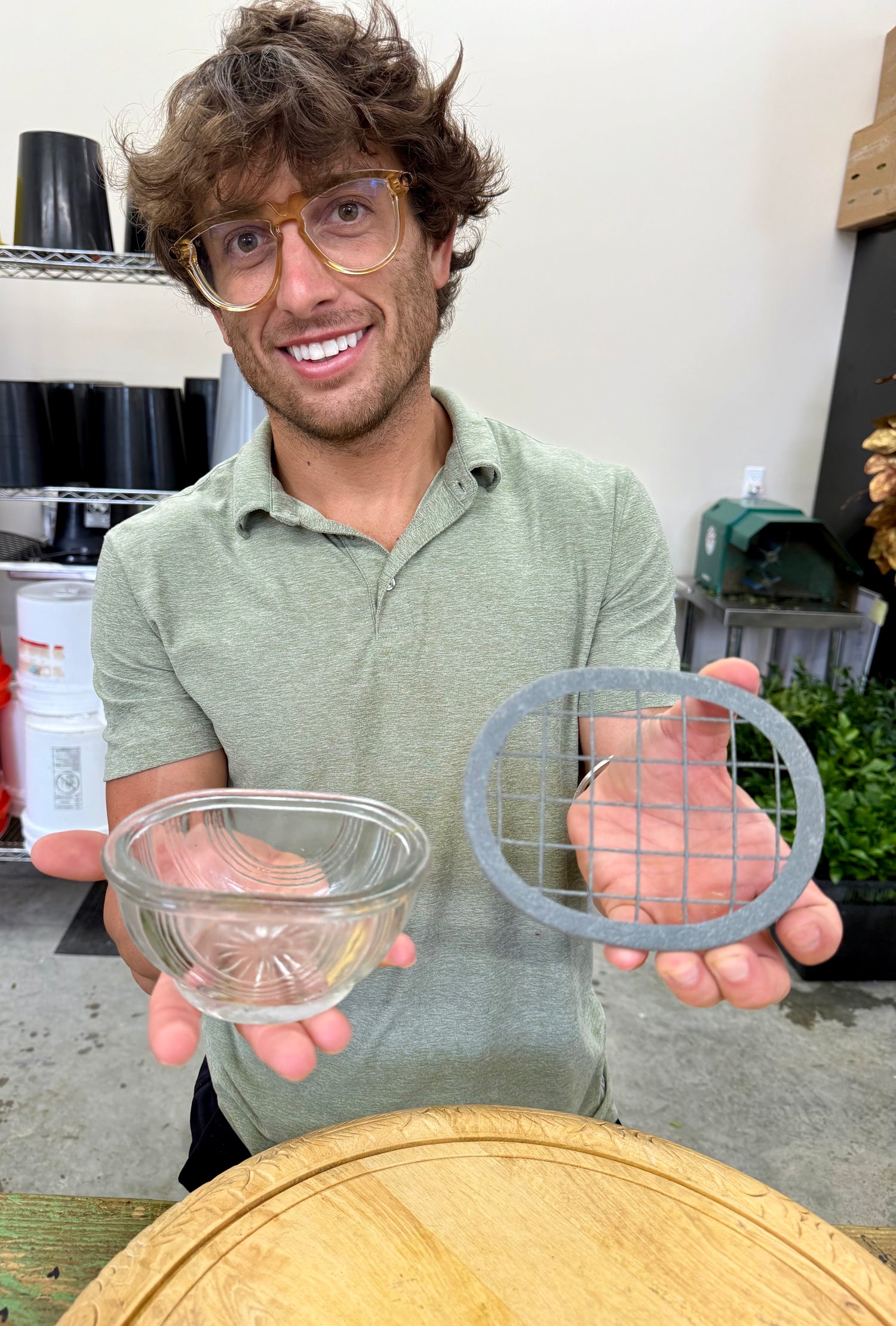 FLORAL FROG. Glass Dish with Metal Floral Frog Lid Measures 5½" long, 4¼" wide and 2½z" tall