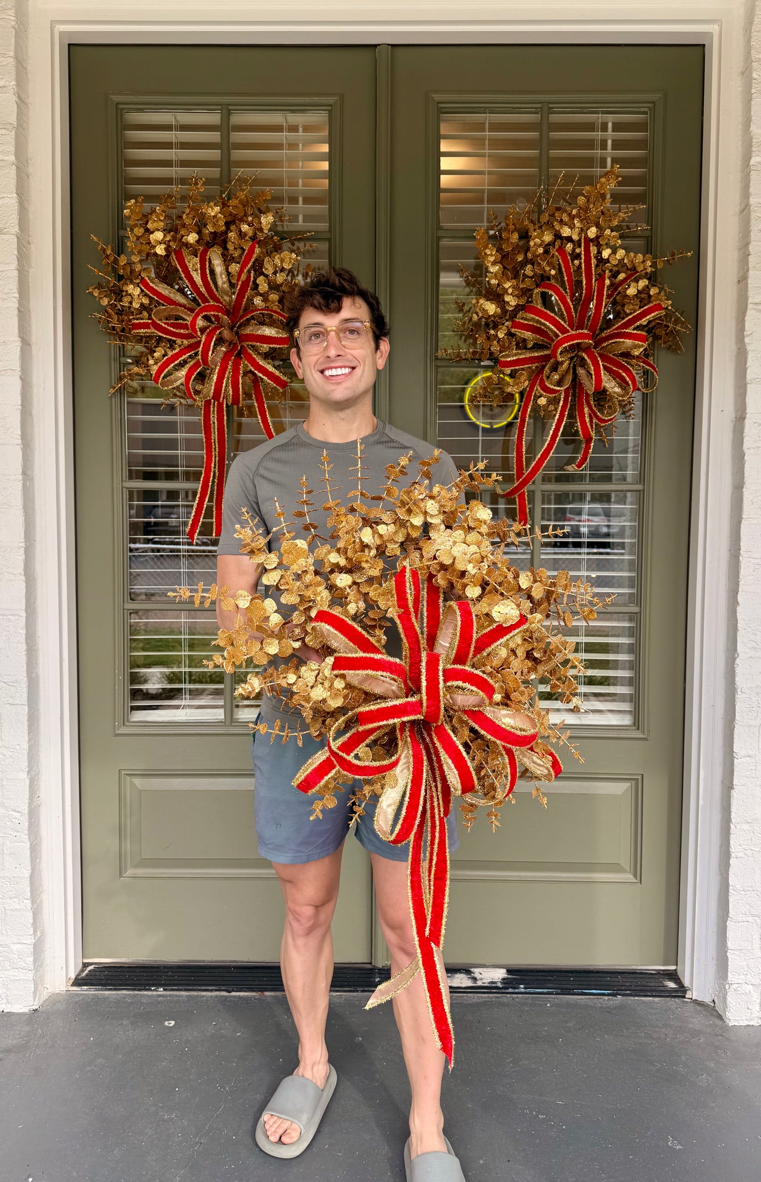 Glittered gold faux eucalyptus. Tied with a JME red velvet and gold tinsel bow. About 20 inches wide.