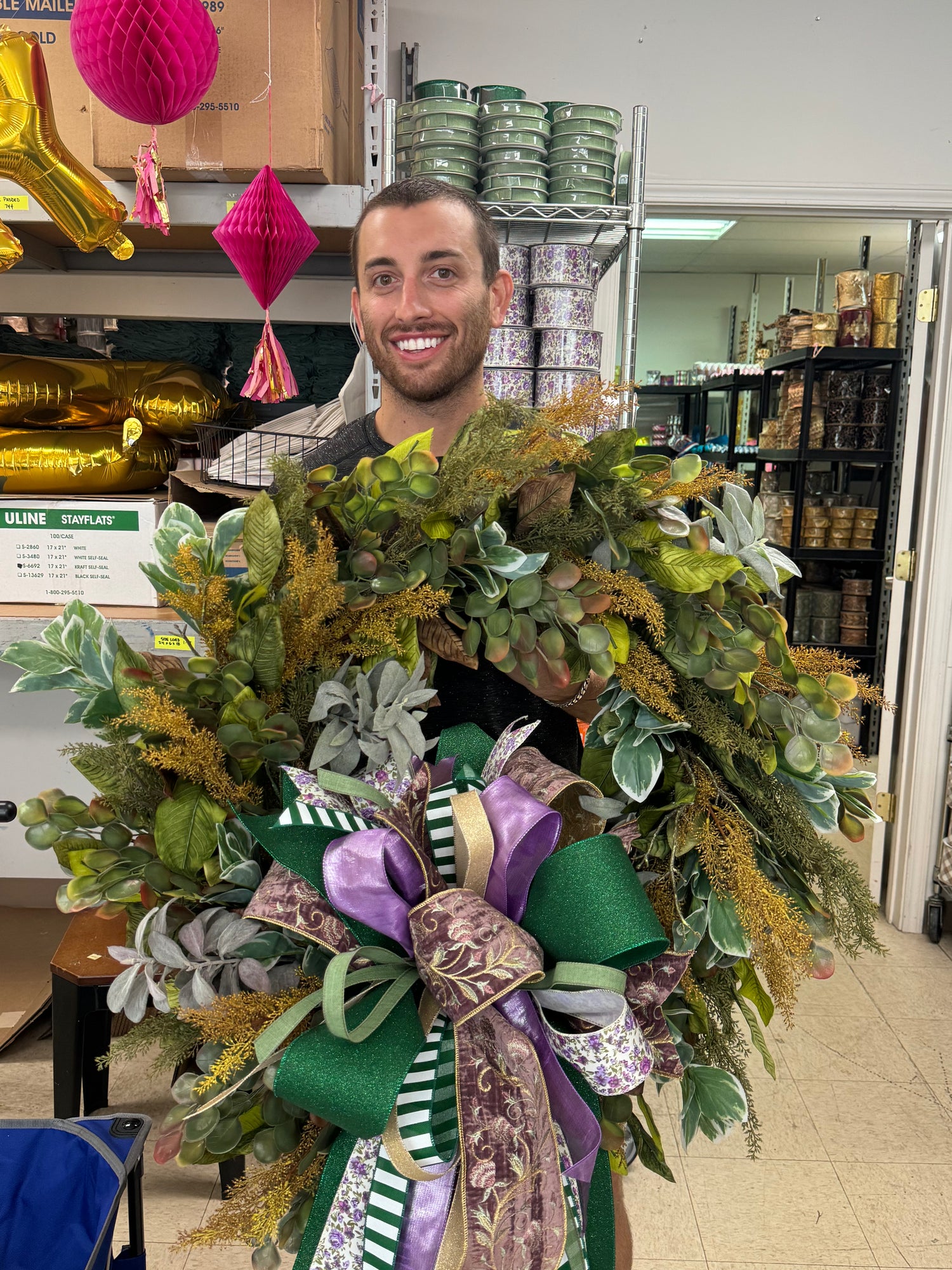 Handmade 30 in mixed foliage wreath WITH PURPLE BOW
