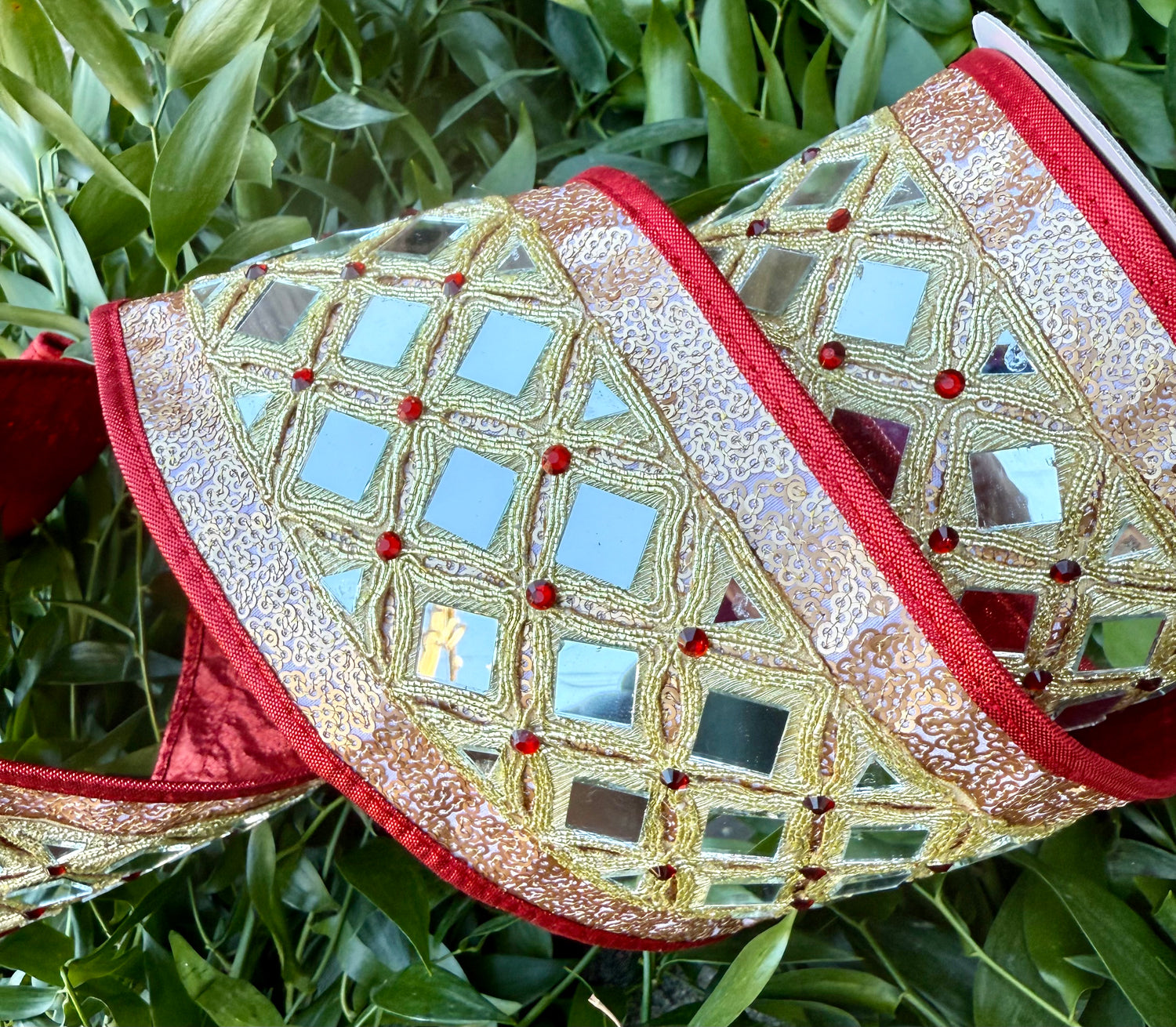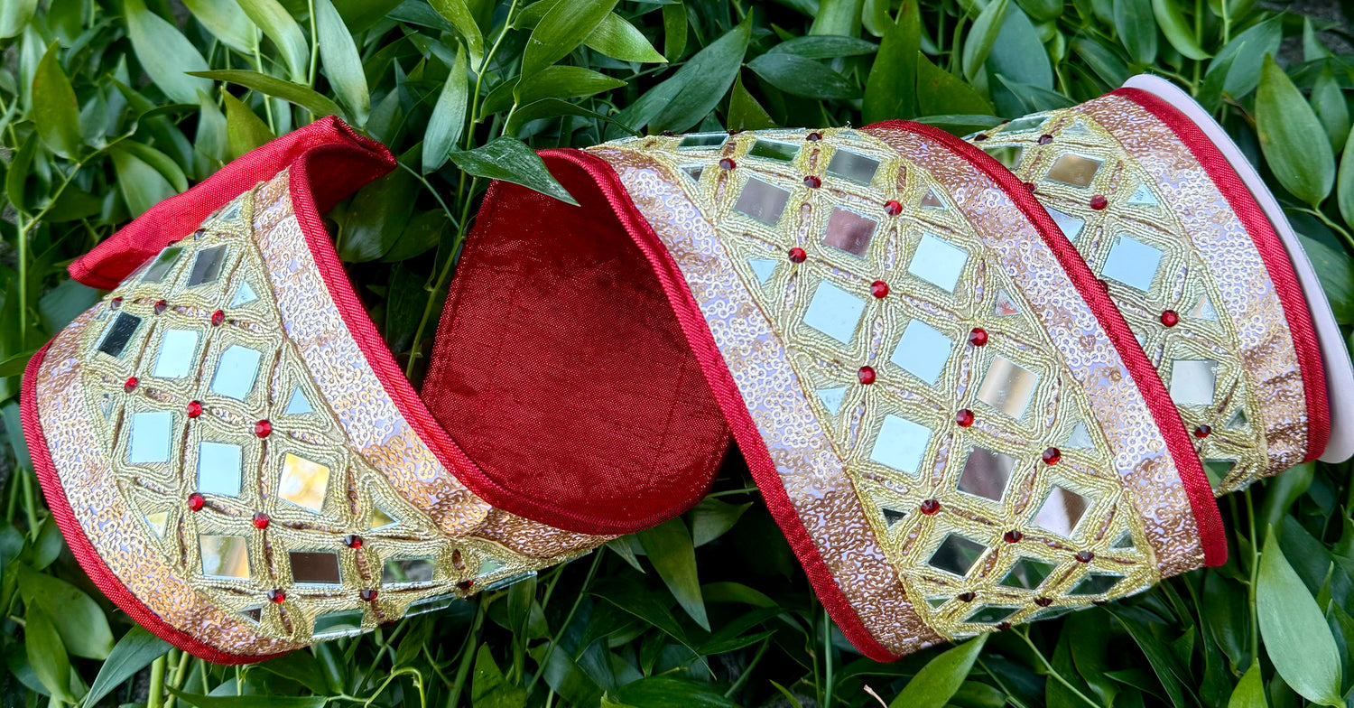 JME heavy wired ribbon. Gold sequin on red metallic with a diamond mirrored band down the center. Backed with red metallic and piped with red metallic. 4” x 5 yards.