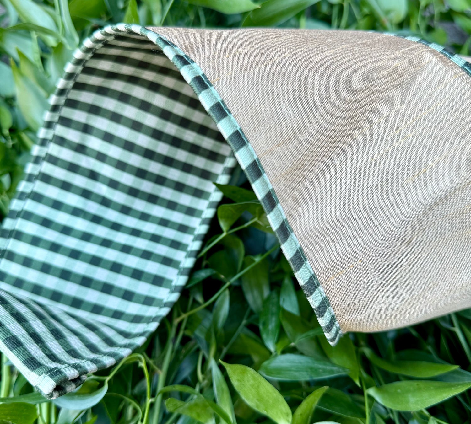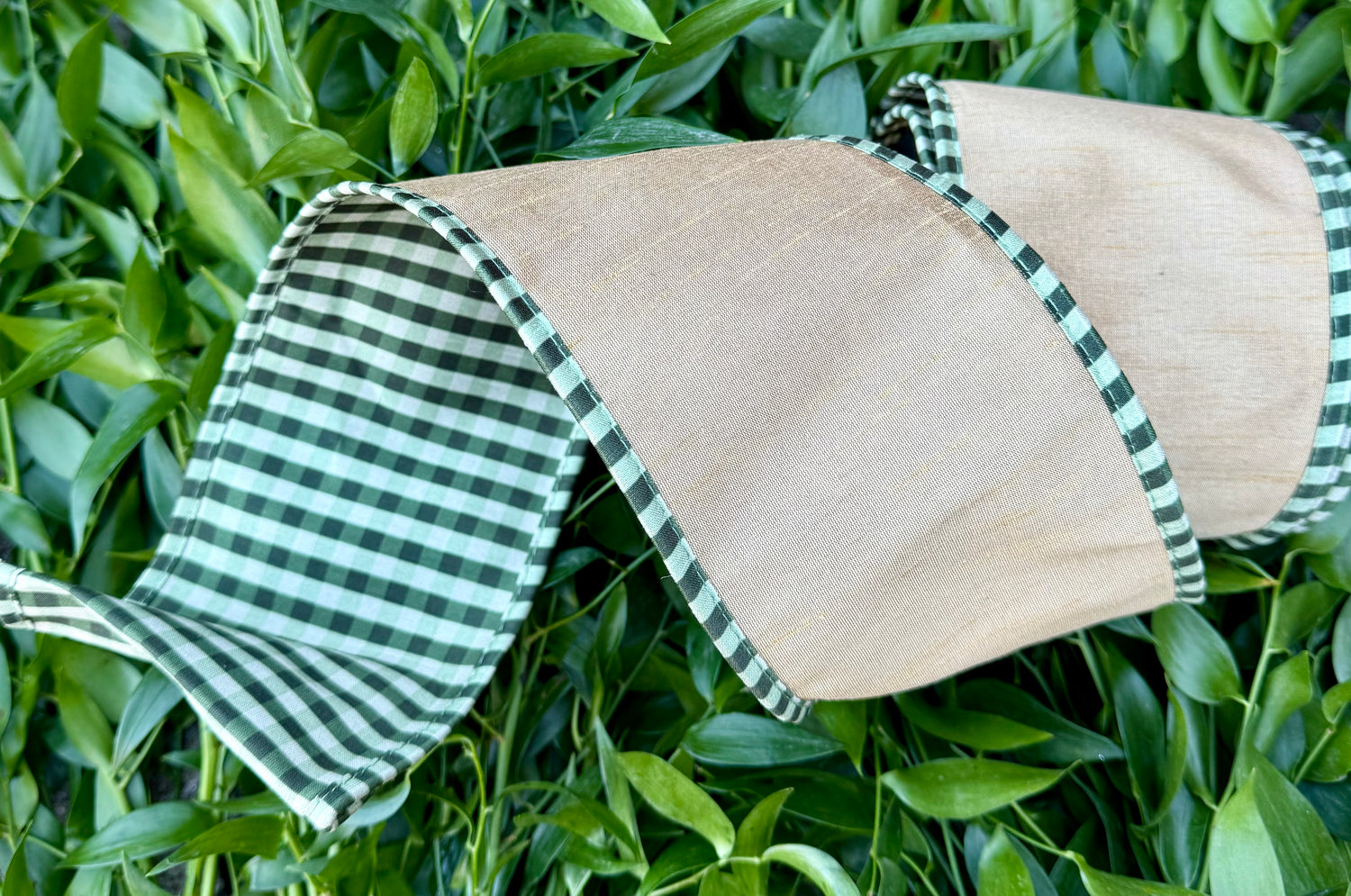 JME cream Taffeta with Small green Check dupion piping and backing. Heavy Wired ribbon. 4"x5YD