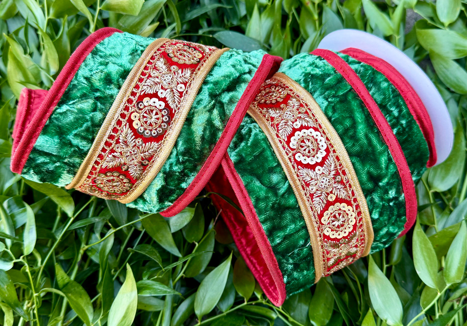 JME Green Crushed Velvet with red and Gold Sequin belt and with Red Metallic Back and pipping. 4"x5YD