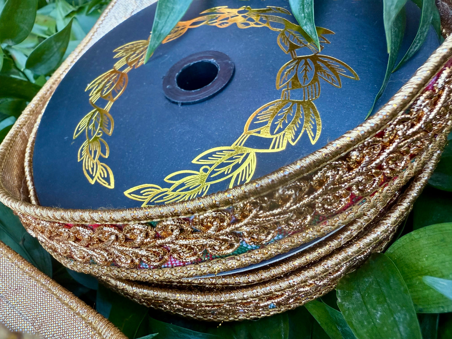JME heavy wire ribbon. GREEN and red plaid with gold embroidering down the center. With gold metallic for the back. 1“ x 10 yards.