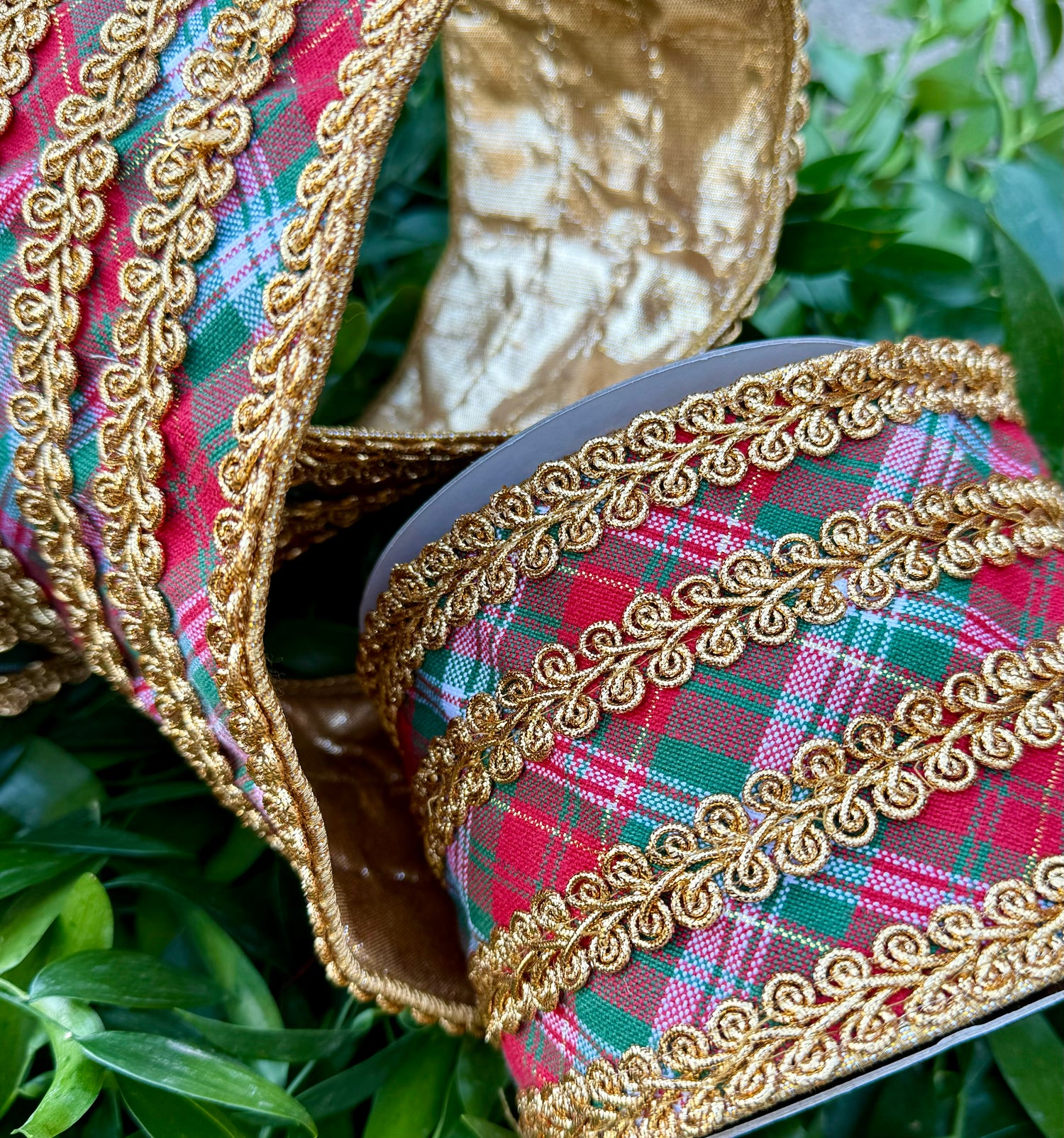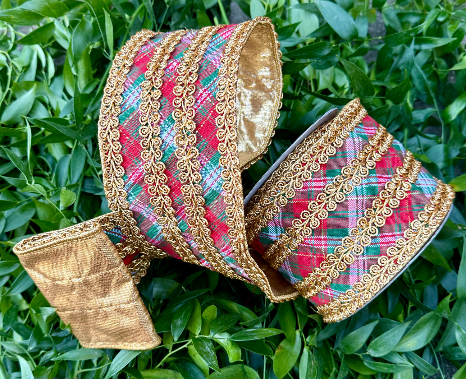JME heavy wire ribbon. Traditional red green white plaid with gold embroidering belts down the center and on the edge. Backed with the gold metallic. 4“ x 5 yards.