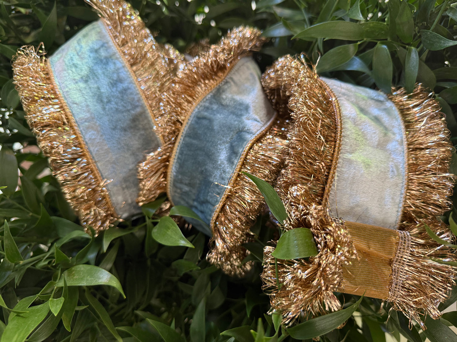 JME heavy wired ribbon. AQUA Velvet with Gold Tinsel Shag Edge 4"x 10YDS