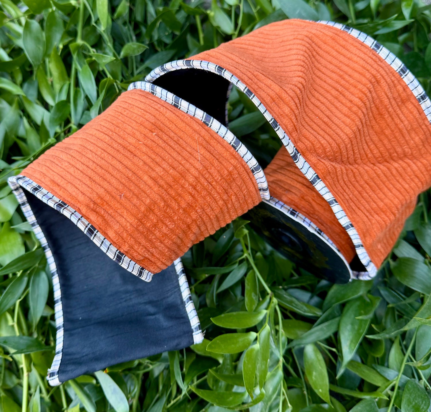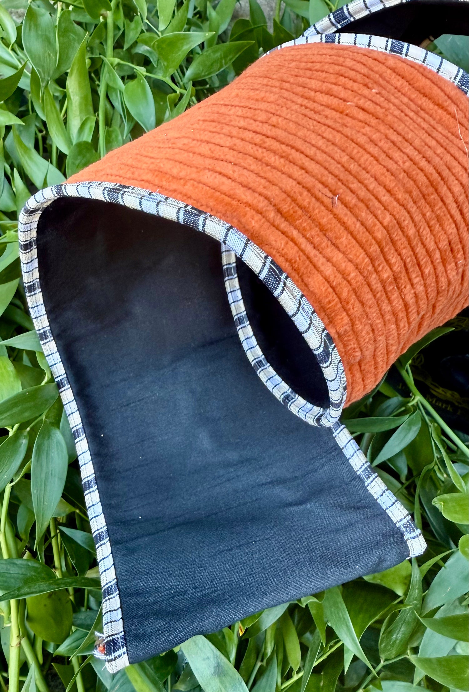 JME heavy wired ribbon. Burnt Orange corduroy backed with black taffeta and piped with black and white checked. 4” x 5 yards.