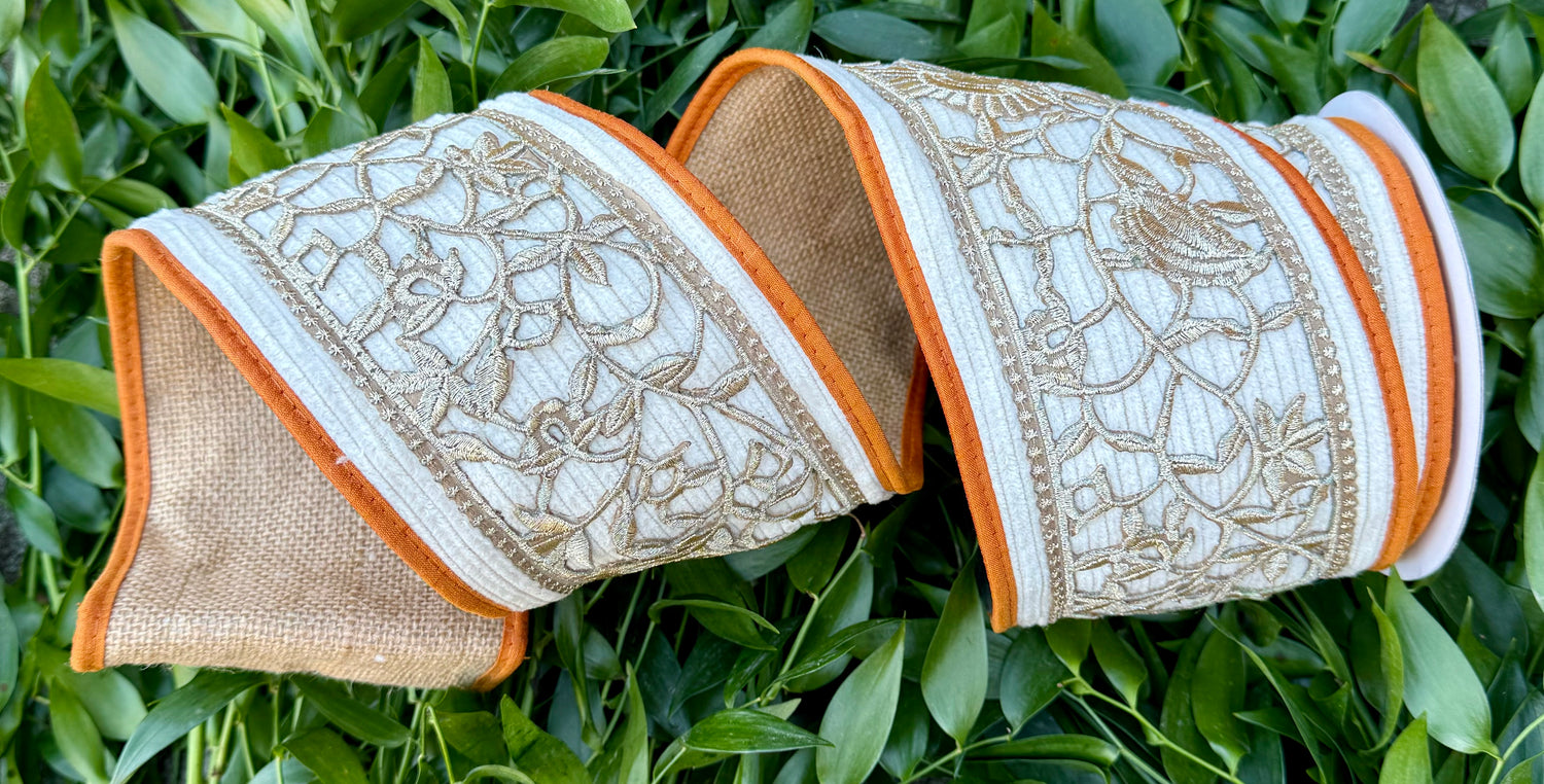 JME heavy wired ribbon. Cream Corduroy with a gold floral belt and orange piping with a burlap back. 4” x 5 yards