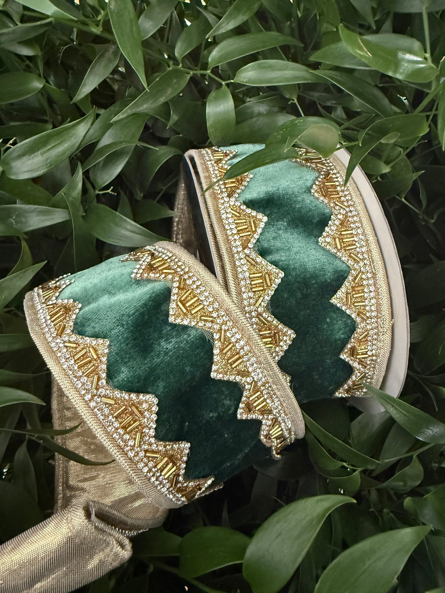 JME heavy wired ribbon. DARK GREEN Velvet with Gold Jeweled Angular Trim and Metallic Back 2.5"x 5YDS
