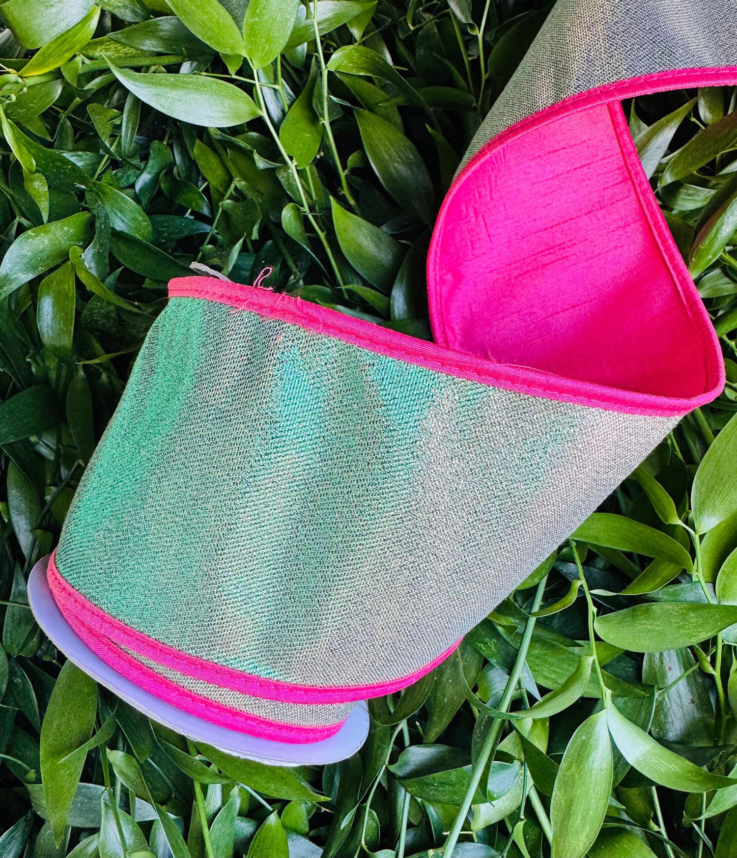 JME heavy wired ribbon double fused, Gold mesh over Green metallic with Pink dupion back 4"x 10yds