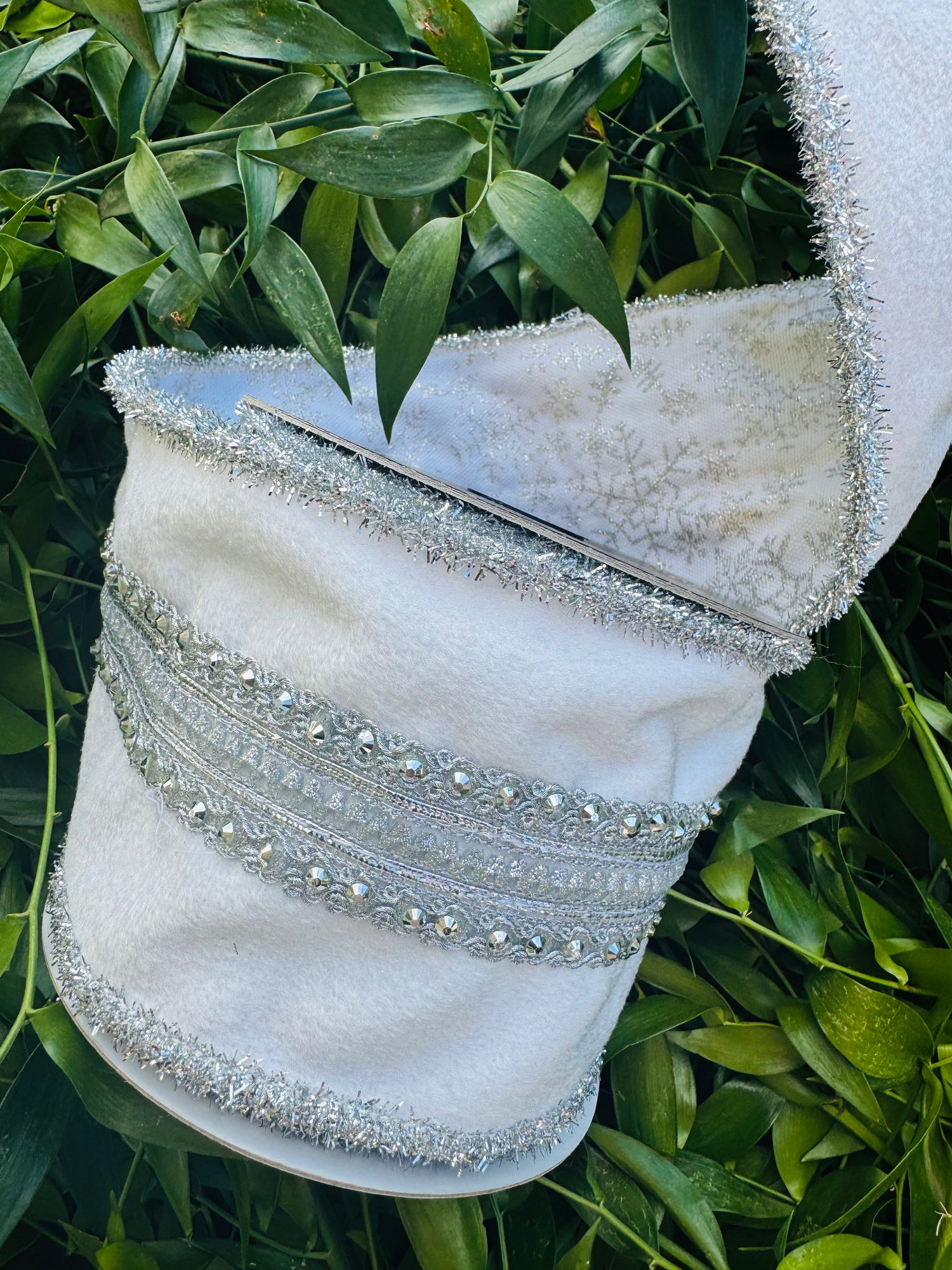 JME heavy wired ribbon double fused, White soft velvet with Sliver band and Sliver tinsel piping with White back and Silver snowflakes 4"x 5yds