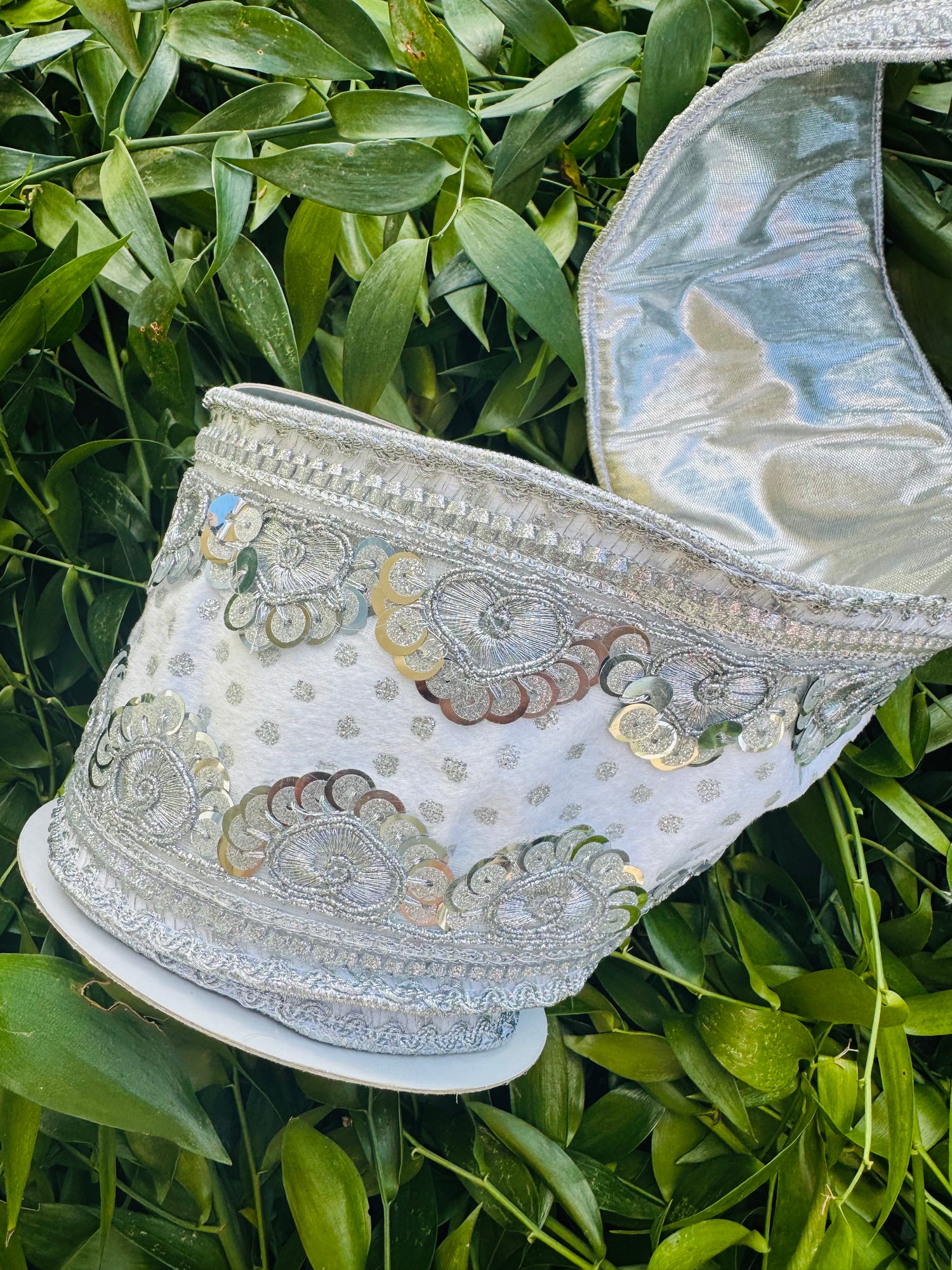 JME heavy wired ribbon double fused , White velvet with Sliver polka dots and Scallop Sequin Trim with Silver metallic back 4"x 5yds