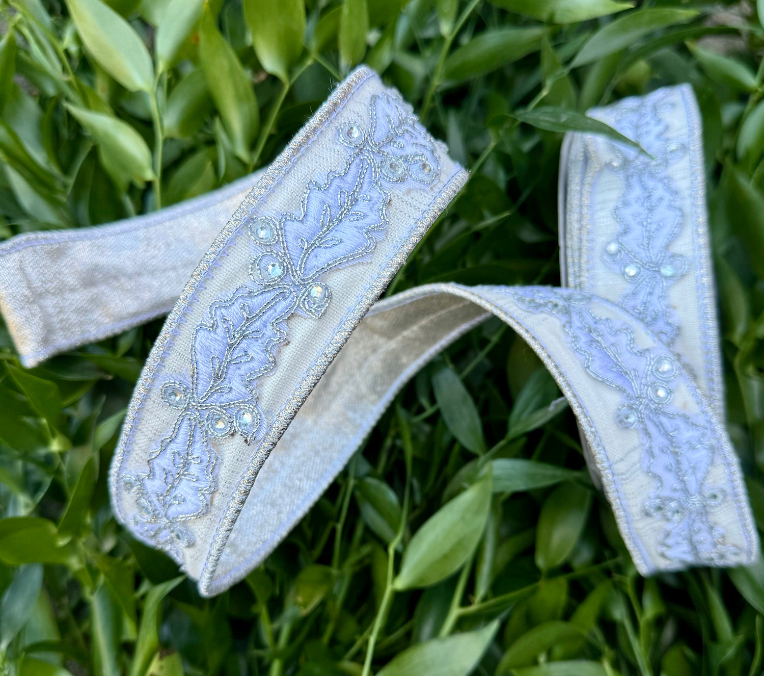 JME Heavy Wired Ribbon. Embroidered Holly on white Plaid with Metallic Back SILVER Ribbon 1.5"x10YD