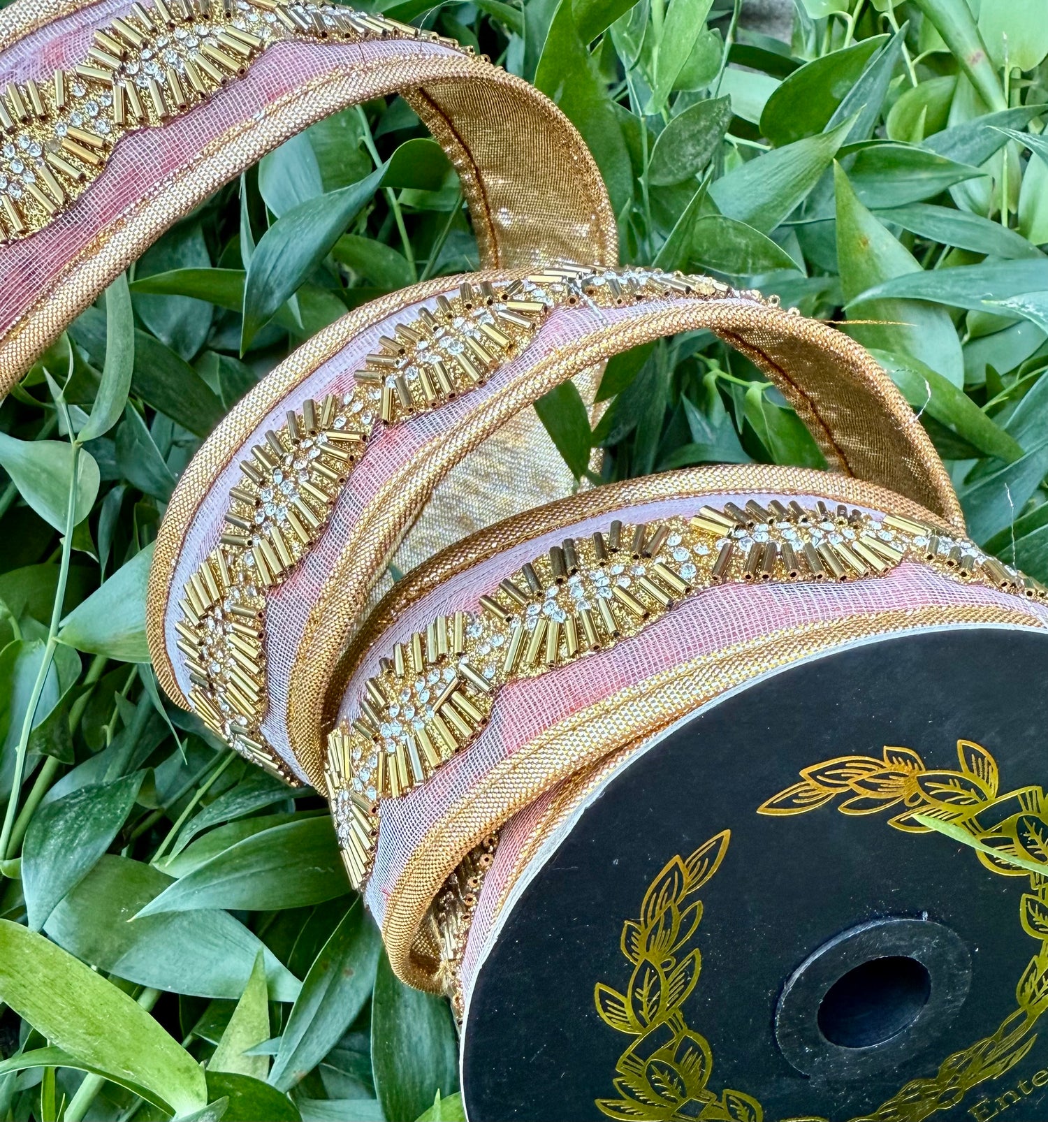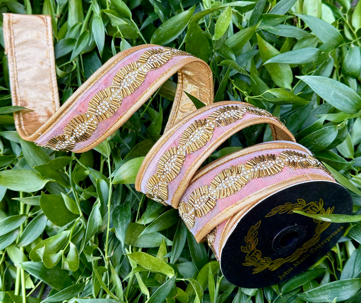 JME heavy wired ribbon. Gold bead belt on red/pink ribbon back with gold. 1.5“ x 5 yards.