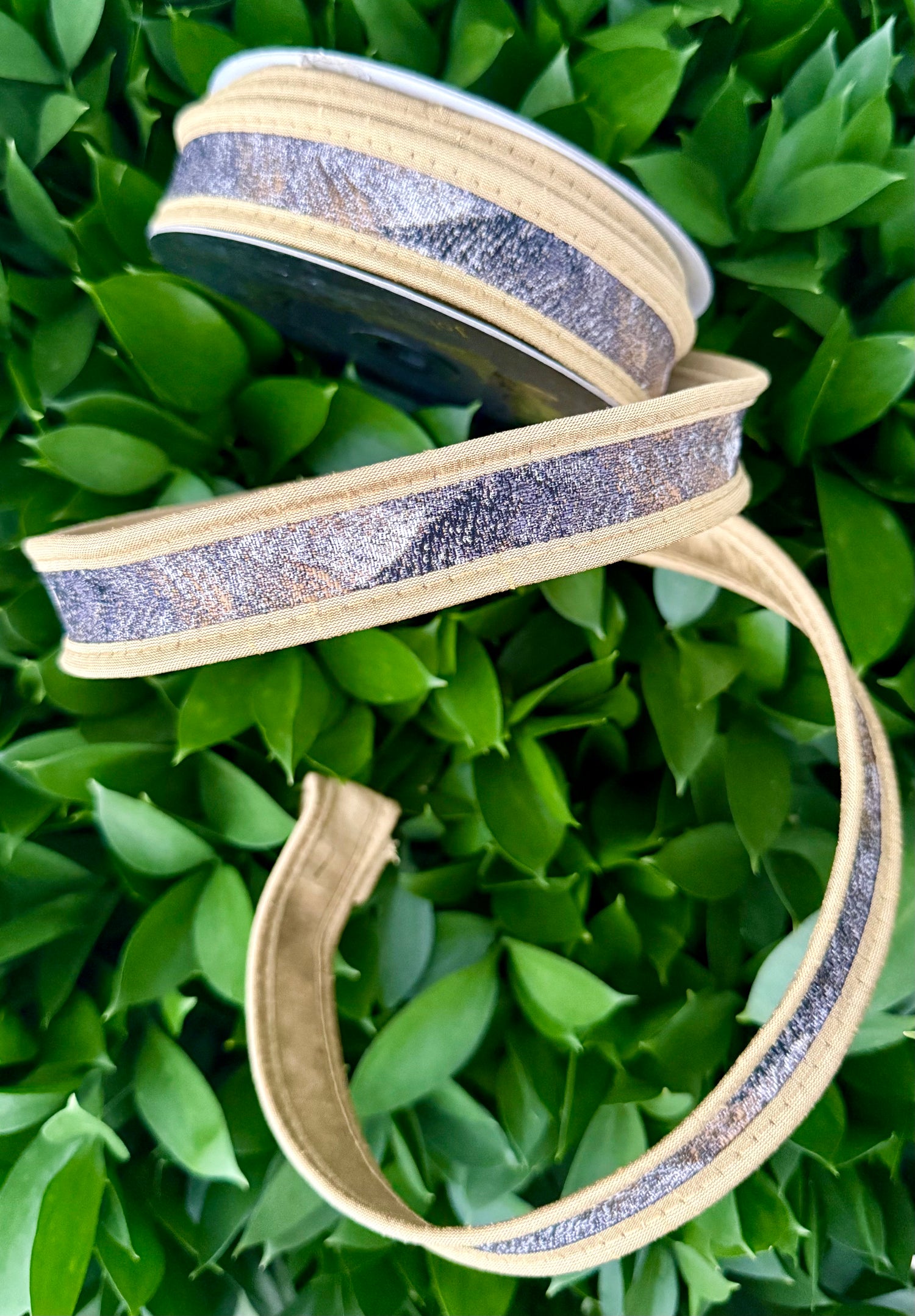 JME heavy wired ribbon. GRAY/BROWN Jacquard Print with Tan Trim 1"x 10YDS