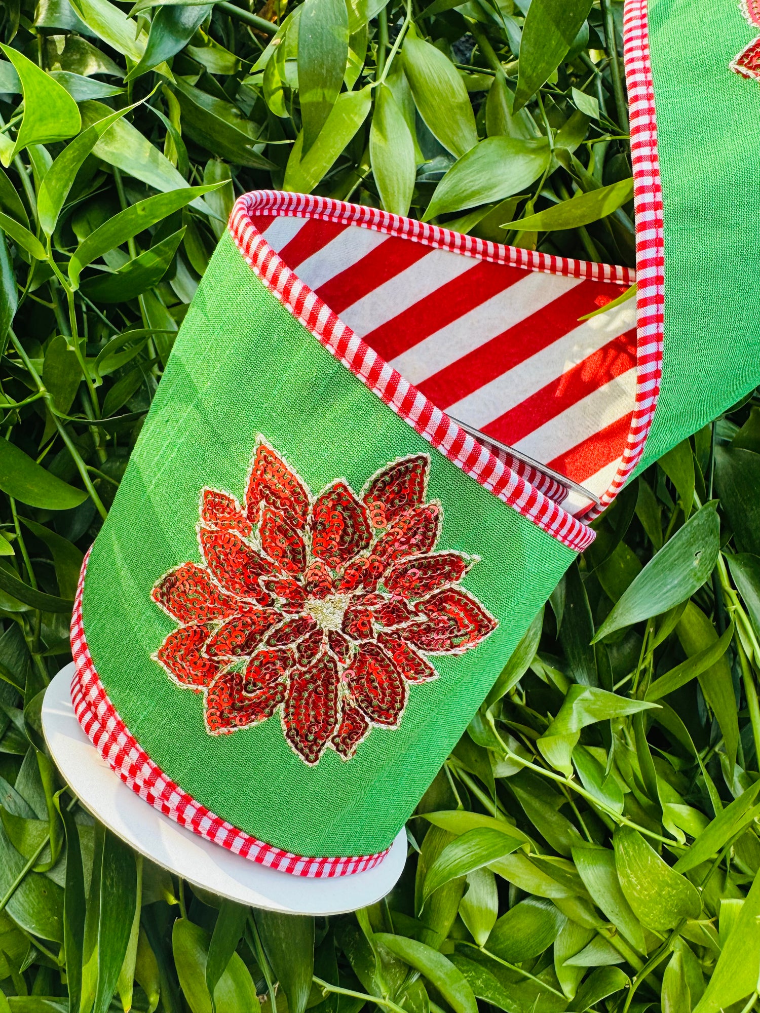 JME heavy wired ribbon, Green and Red sequin poinsettia with Candy Cane Stripe Back 4"x 5yds