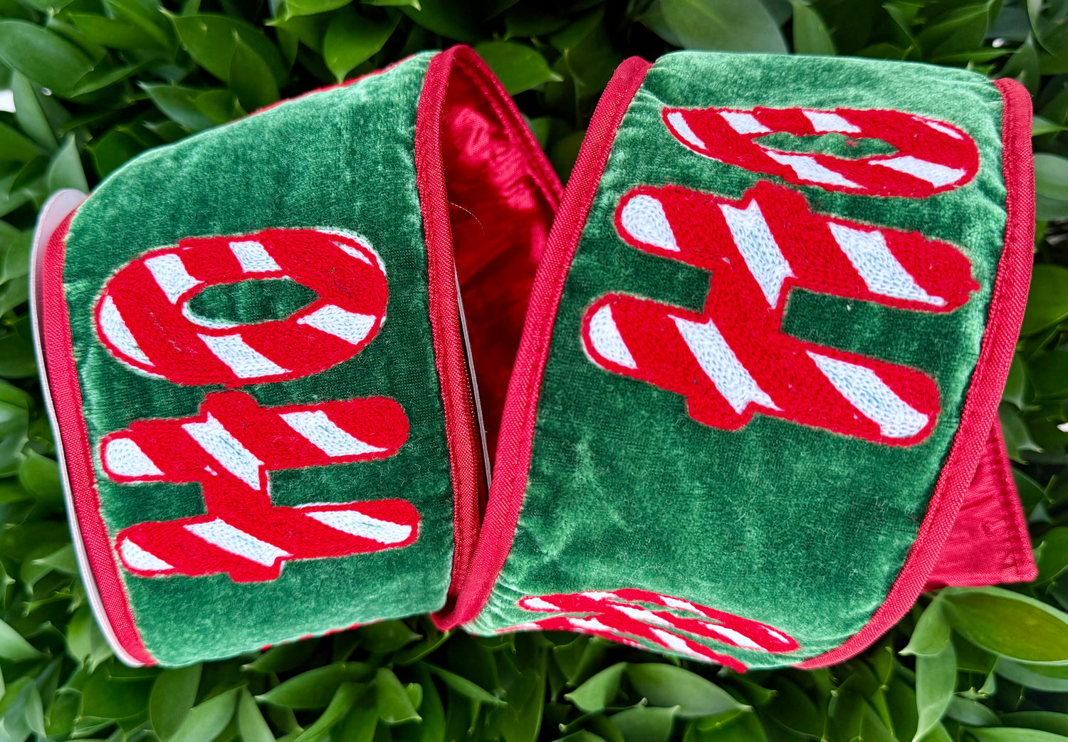 JME heavy wired ribbon. GREEN Velvet with Embroidered "Ho Ho Ho" 4"x 10YDS