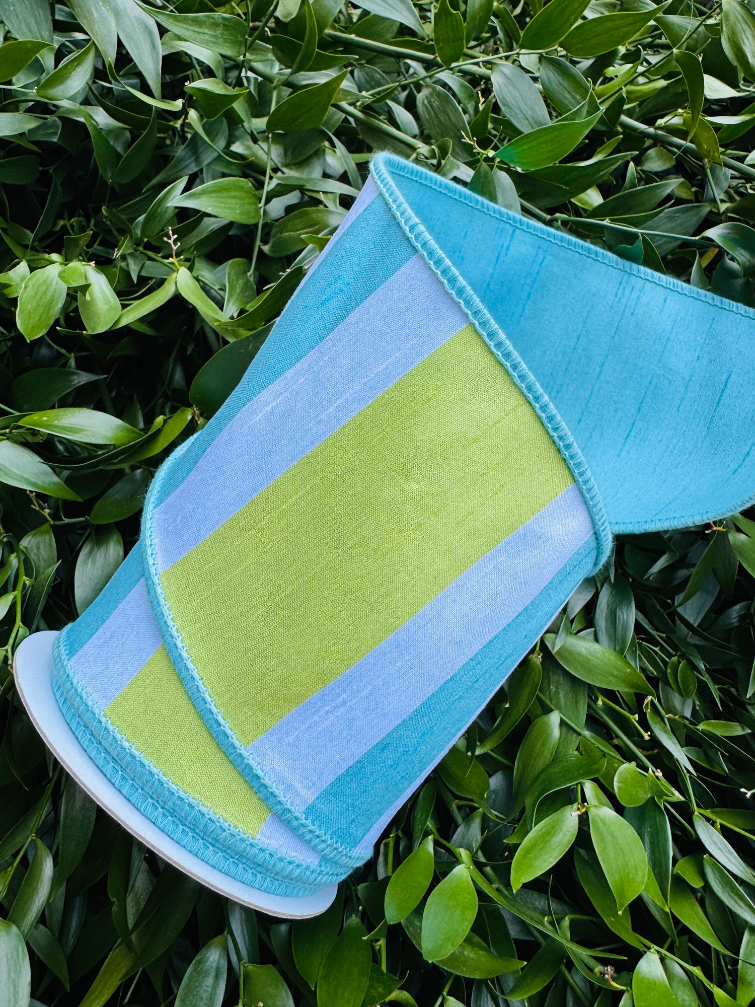 JME heavy wired ribbon. LIME/BLUE Stripes with Blue Dupion Back 4"x 10YDS