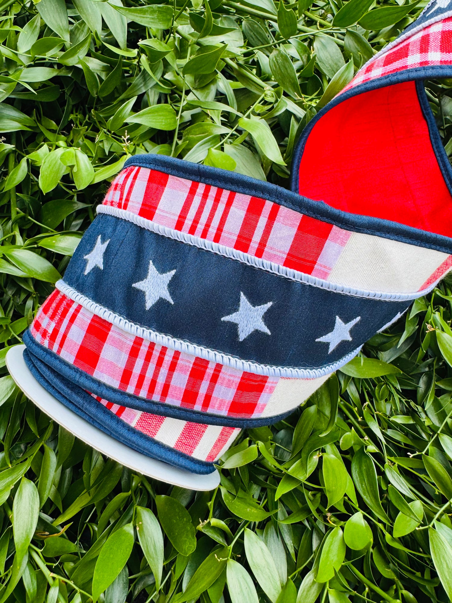 JME heavy wired ribbon. NAVY/WHITE Star Band on Red/White Plaid with Red Dupion Back 4"x 5YDS