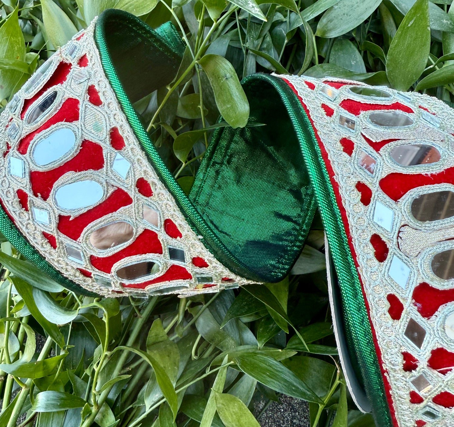 JME heavy wired ribbon. Red ribbon with mirrors. 2.5” x 5 yards. Back with green metallic ribbon and piped.