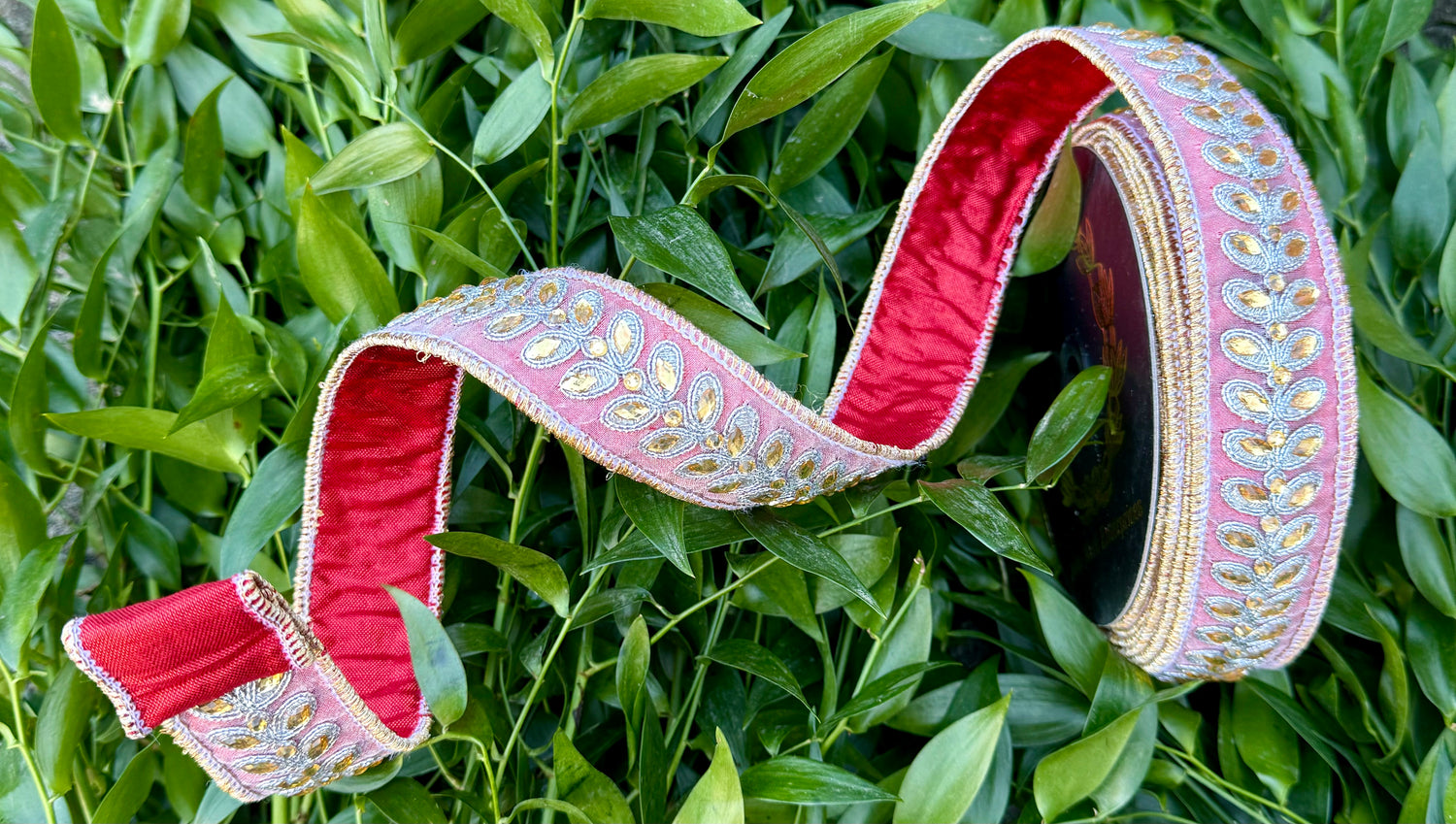 JME heavy Wired ribbon. Red metallic backed with Jeweled Leaf Band. Dupion Ribbon 1.5"x10YD