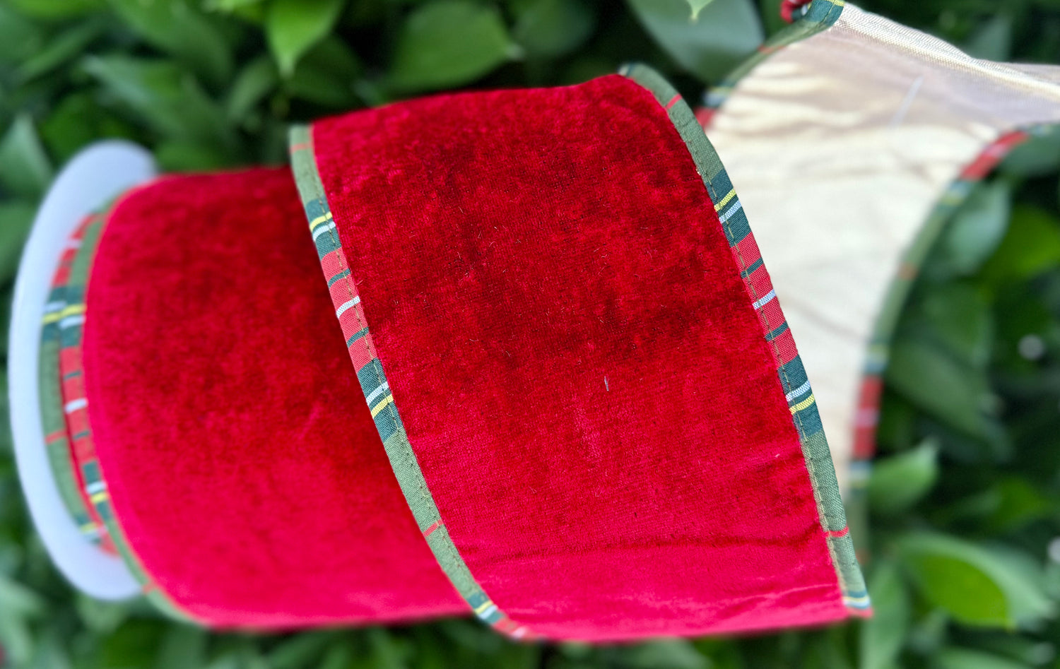 JME heavy wired ribbon. RED Velvet with Plaid Trim and Gold Metallic Back