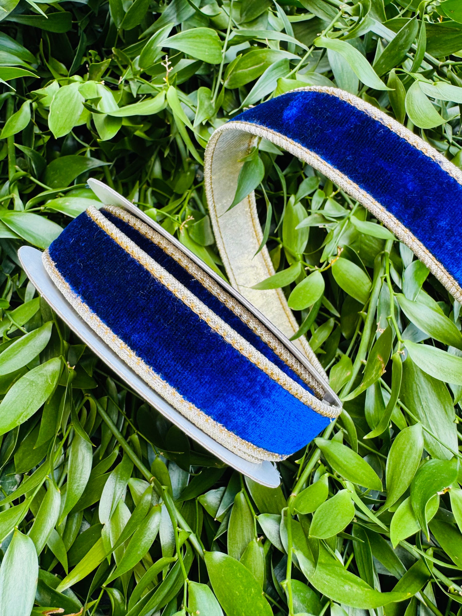 JME heavy wired ribbon. Royal blue velvet backed with gold metallic dupion. 1“ x 10 yards