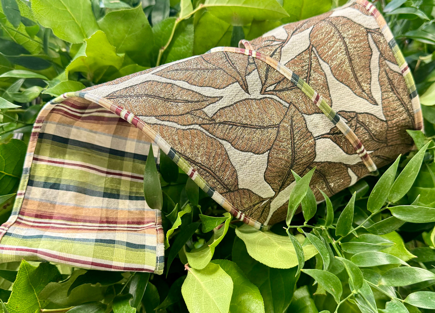 JME heavy wired ribbon. Leaf Pattern with dupion Plaid Back and piping. Heavy wired ribbon. 4 inches by 10 yards.