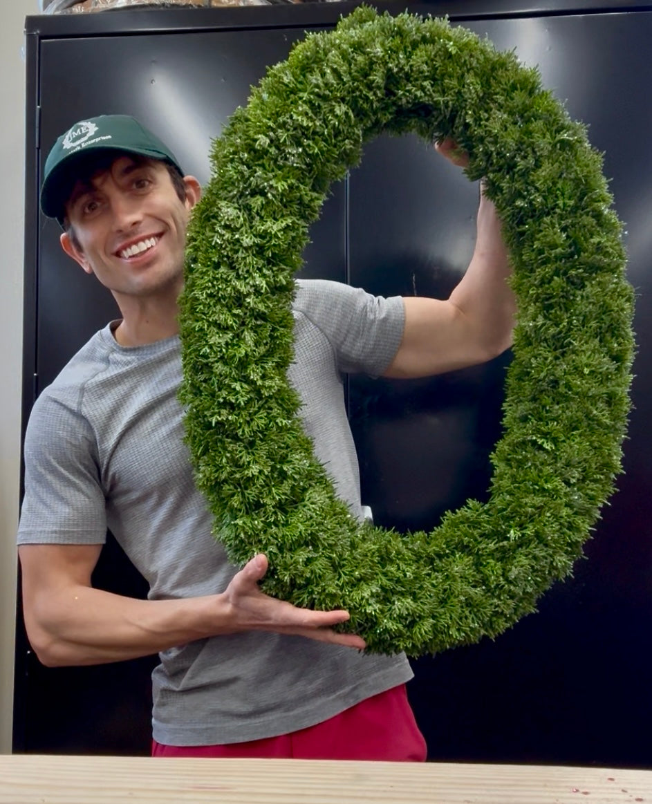 Oval frosted faux cedar wreath. 23inches wide by 30.5 inches long