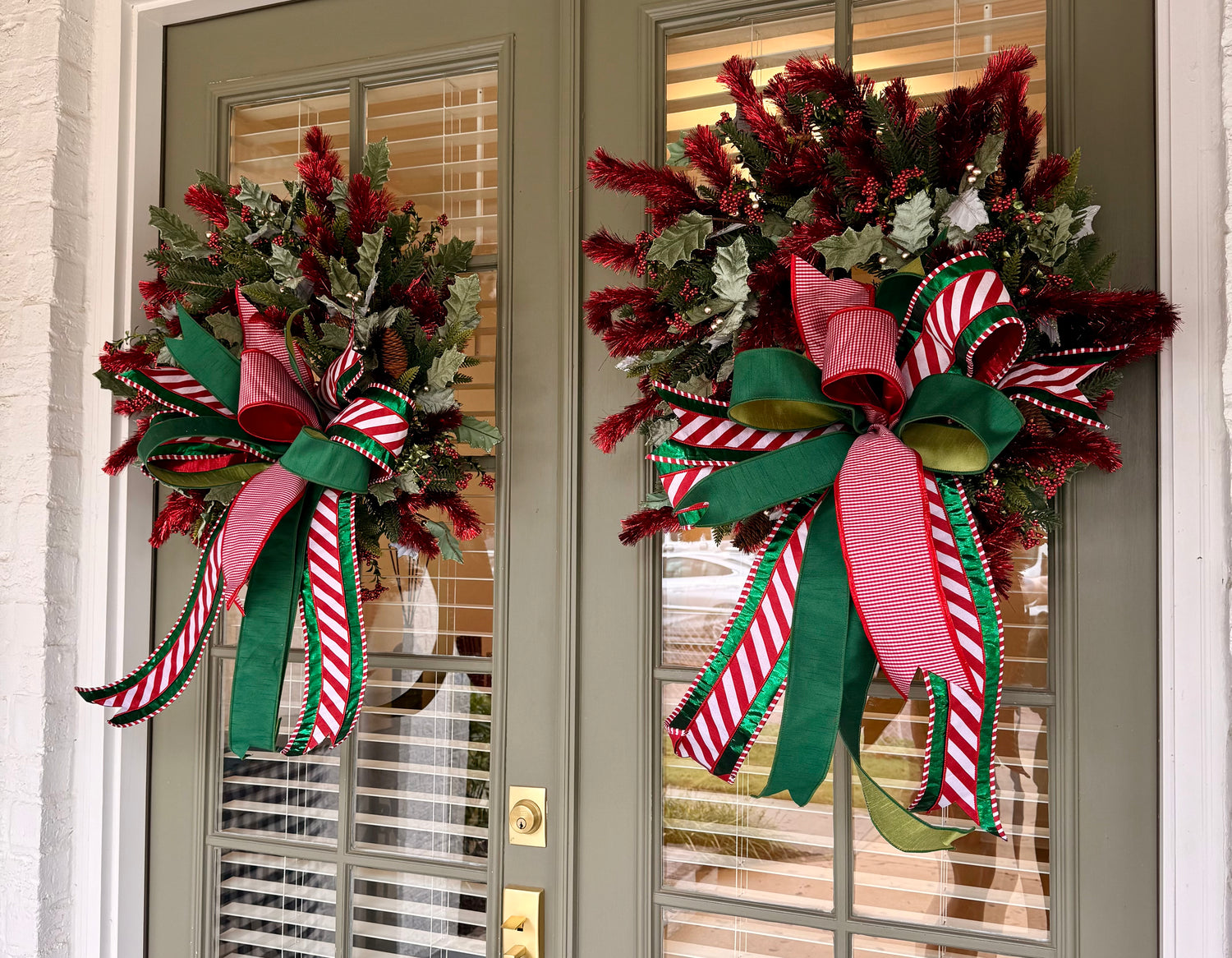 Red tinsel wreath with JME hand-tied bow. About 24 inches wide.