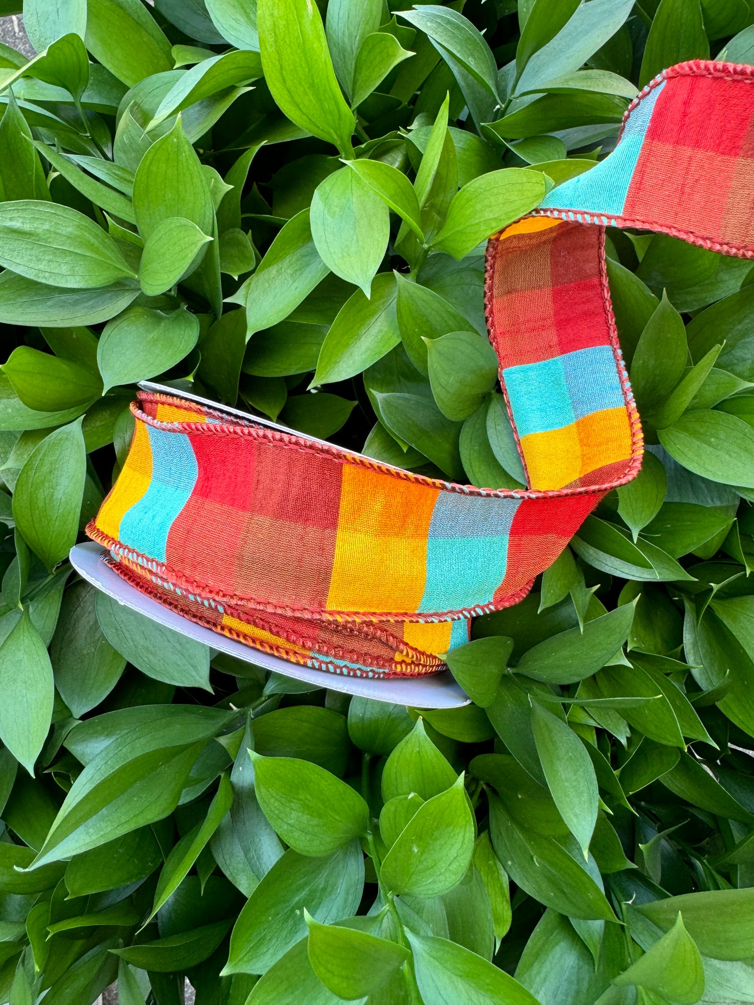 Rust/Yellow/Teal Check Wired Ribbon 1.5"x 20YDS