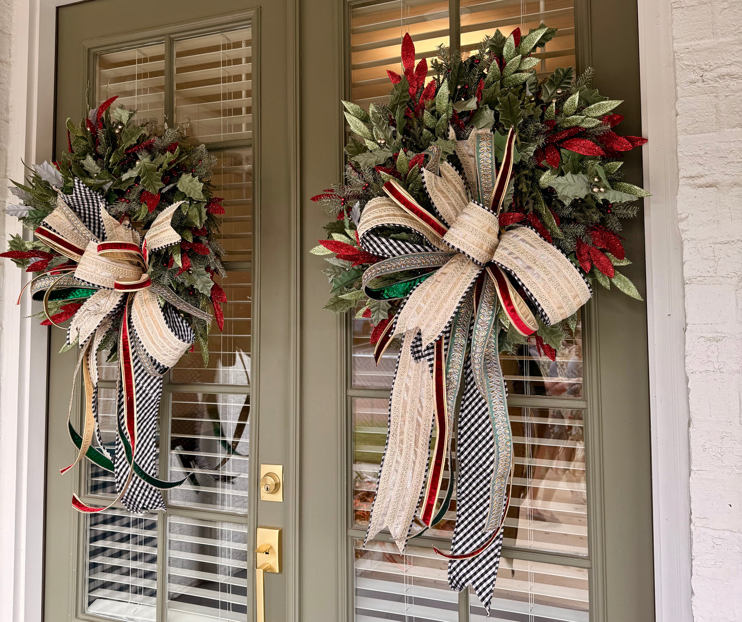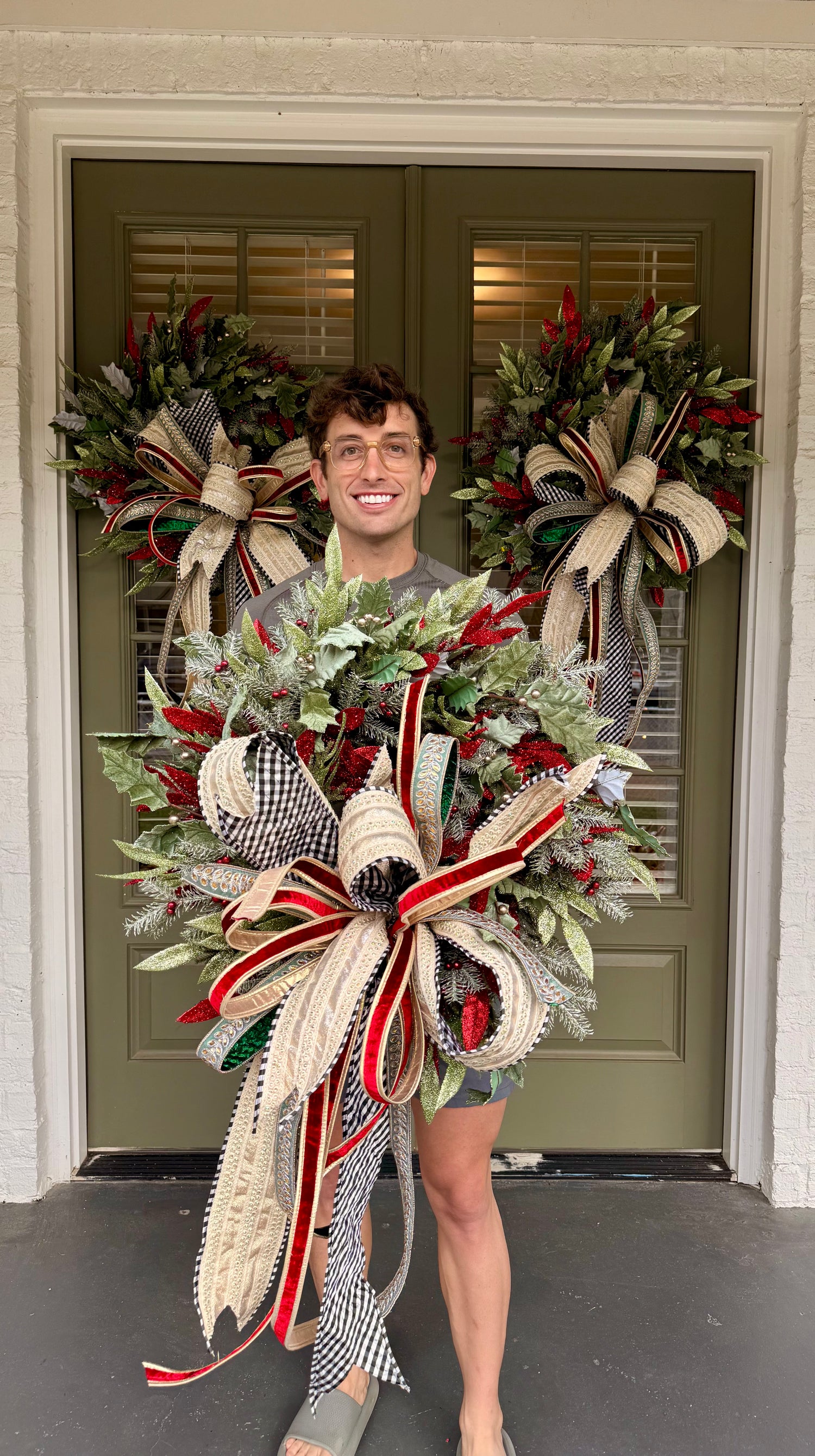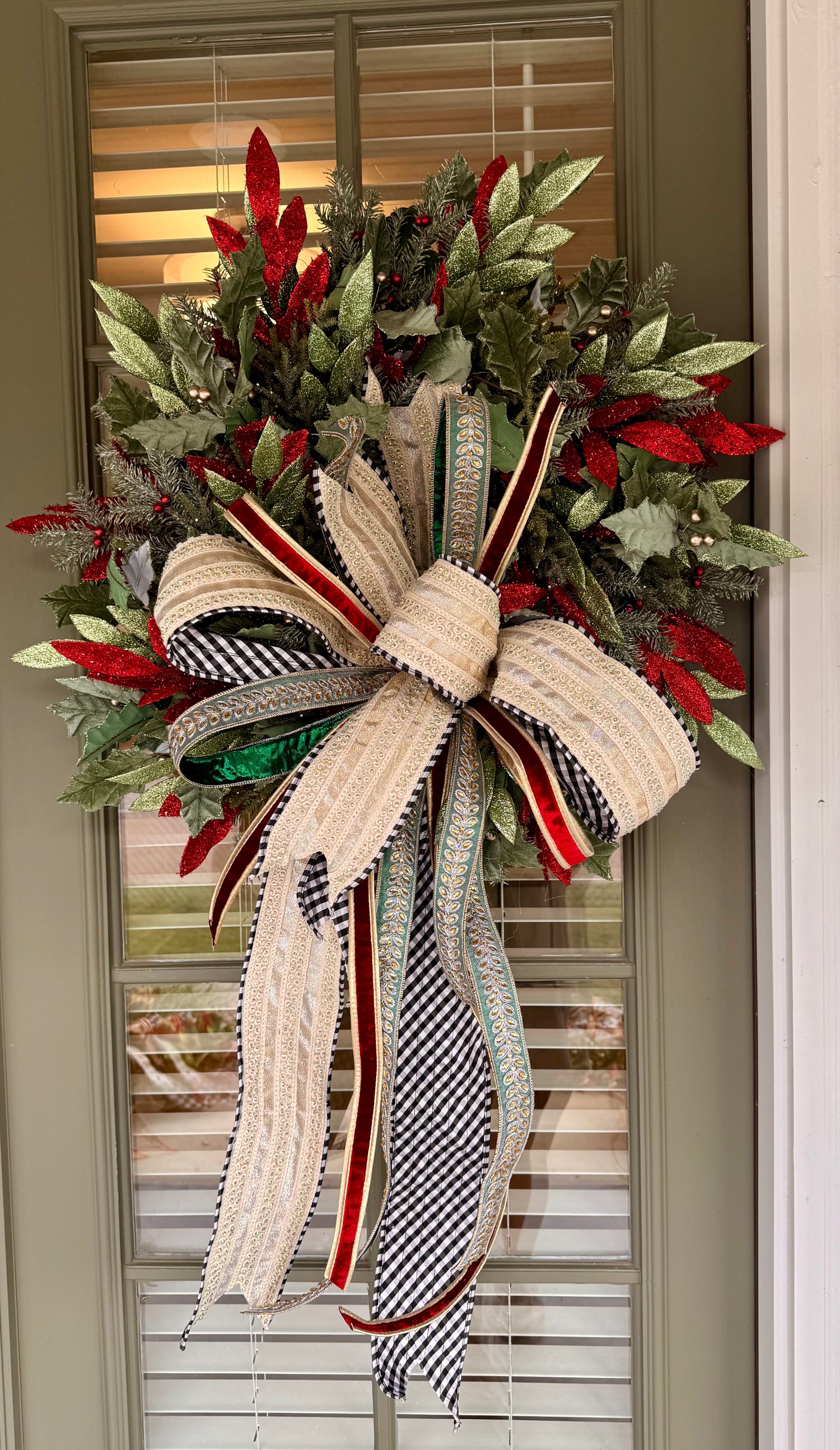 Sage, red, and green faux wreath made by JME paired with a hand tied JME bow with a touch of black and white! Very full About 24 inches wide