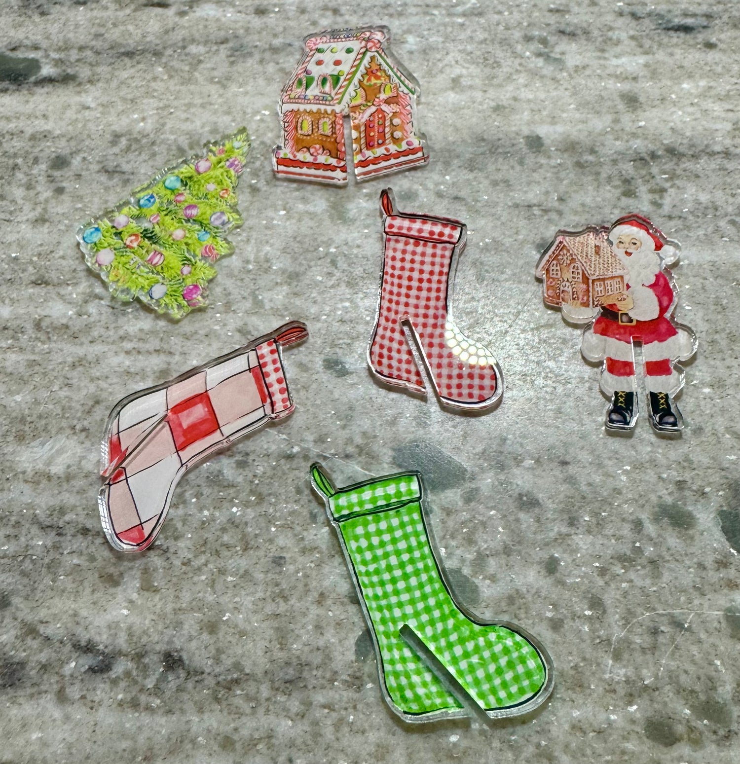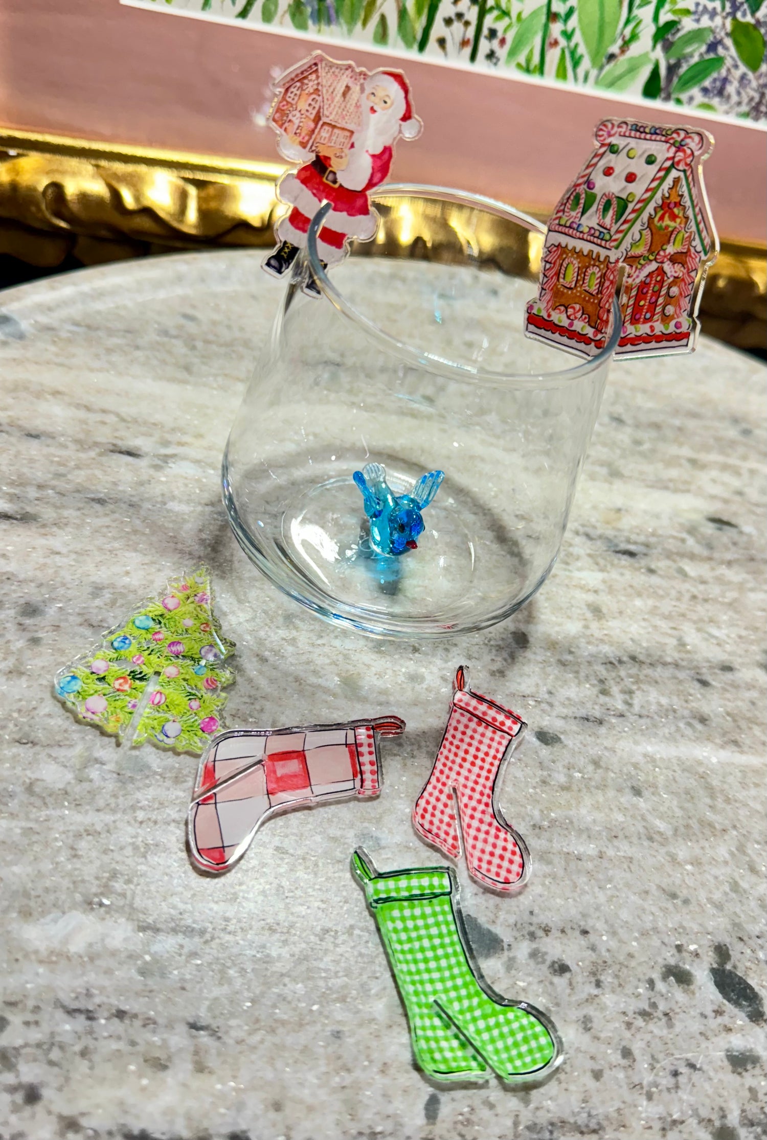 Sweet Christmas drink markers. Set of 6. Santa, stockings, gingerbread house, and Christmas tree.